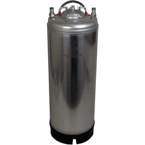 5 gallon stainless steel ball lock keg with metal strap handle.
